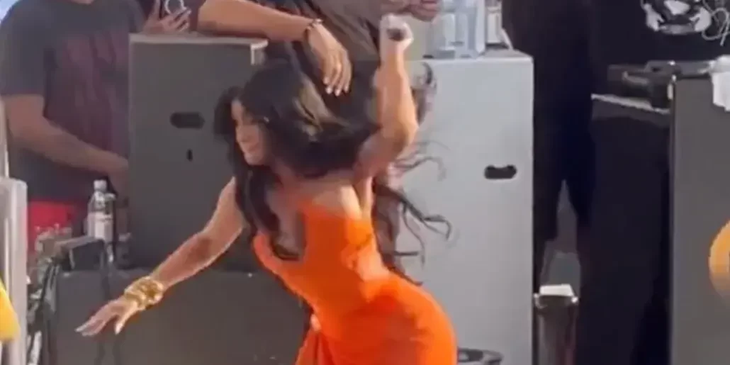 En redes sociales circula un video en el que aparece Cardi B con un atuendo naranja cantando en uno de los escenarios de aquel club de playa y de pronto una persona de la audiencia lanzó un vaso con un líquido.